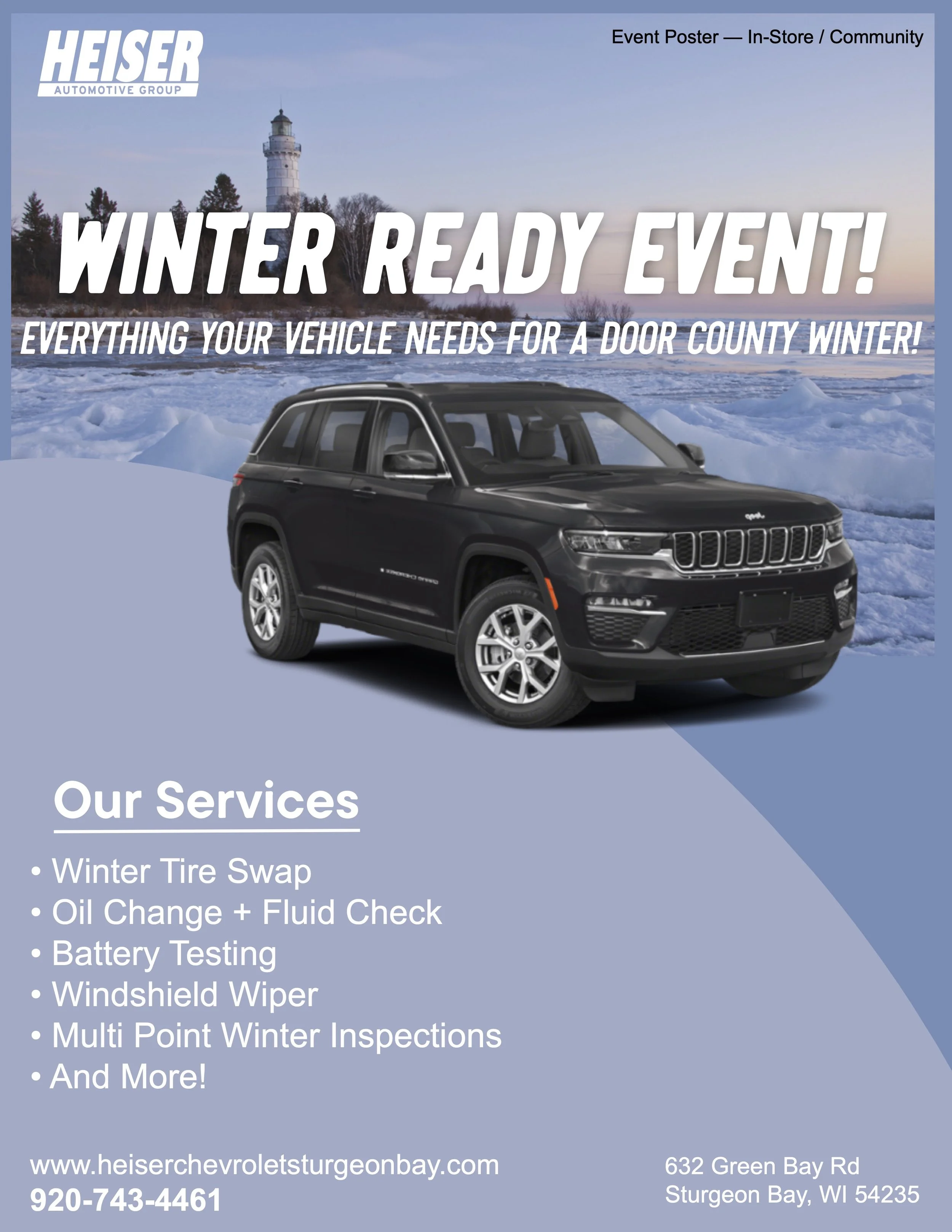 Help locals feel confident driving through Door County winter. Position Heiser as practical, trustworthy, and community-first